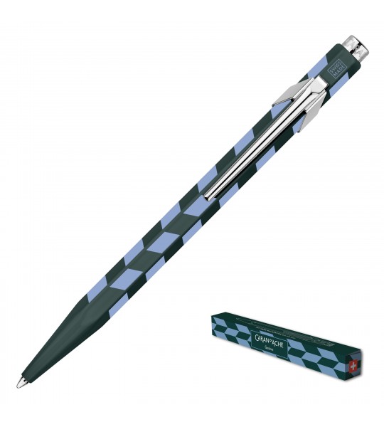 Długopis 849 wykonamy jest z aluminium. Posiada sześciokątny korpus lakierowany w kolorze świerkowej zieleni z niebiesko-szarym, wytłoczonym geometrycznym wzorem. Długopis posiada przyciskowy mechanizm wysuwu wkładu. Wyposażony w bardzo pojemny wkład długopisowy Goliath czarny M, który pozwoli nam na zapisanie 600 stron A4.