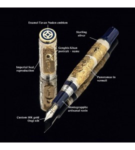 Pióro stworzone przez Montegrappę we współpracy z mongolskim potentatem od dóbr luksusowych Tavanem Nudenem. Pióro Chingis Khaan oddaje hołd Czyngisowi Khaanowi (1162-1227): legendarnemu wojownikowi, przywódcy i założycielowi imperium mongolskiego – postaci zwanej „Człowiekiem Tysiąclecia” zarówno przez „Washington Post”, jak i magazyn „Time”. Był on wojownikiem i reformatorem politycznym, którego podboje przyniosły światu niespotykany pokój i porządek. Ta specjalna edycja, stworzona wyłącznie w edycji 99 piór wiecznych. Dwie panoramy w kolorze Vermeil na korpusie ilustrują najazdy jeźdźców mongolskich, wznoszące się nad punktami orientacyjnymi rozległego imperium rozciągającego się od Oceanu Spokojnego po Morze Kaspijskie. Na ręcznie wykonanej stalówce z 18-karatowego złota widnieje znak Ongi – starożytny symbol nieba i ziemi, znajdujący się na monetach bitych za panowania Władcy Uniwersalnego. 99 piór wiecznych w tym wydaniu nosi imiona dwóch rzemieślniczych strażników z przeciwległych krańców ziemi: są to symbole największego przylegającego imperium, jakie kiedykolwiek znał świat.