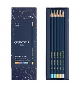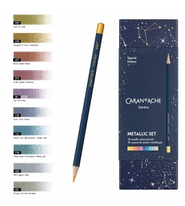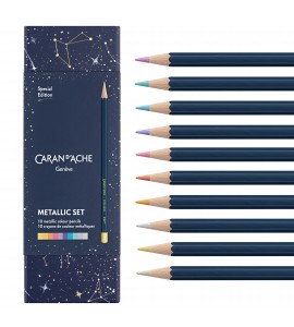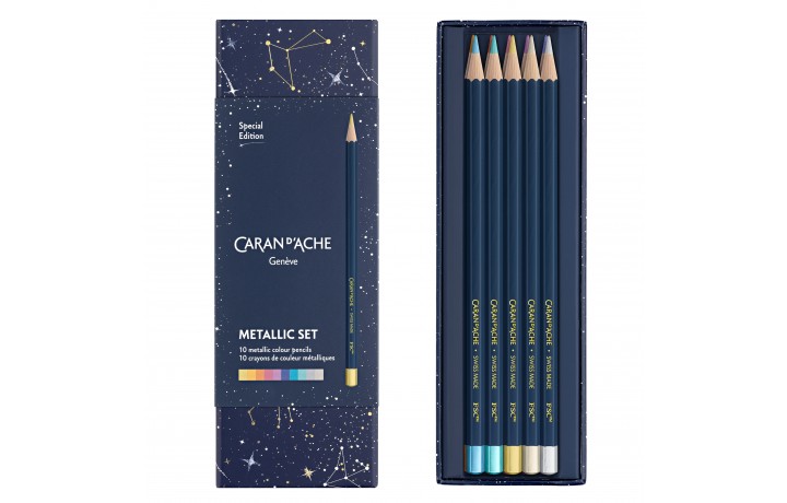 Zestaw składa się z 10 kredek ołówkowych w metalicznych kolorach. Wykonane zostały z najwyższej jakości drewna cedrowego z certyfikatem FSC. Kredki posiadają miękki i wytrzymały grafit o średnicy Ø 3 mm. Matowy niebieski korpus kredki i metaliczna końcówka o średnicy 10 mm z dopasowanym kolorem kredki. W zestawie znajdziemy również 10 permanentnych pasteli woskowych.